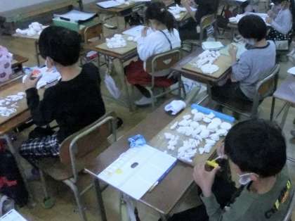 粘土でつくったオリジナル弁当に色をつけました。うすい色から塗っていきます。