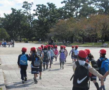 10月30日、1年生は、「浜寺公園」に行きました。はじめての校外活動で、マナーやルールに気をつけて電車にも乗りました。