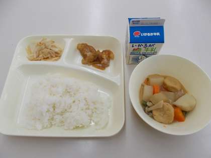 「含め煮」は、けずりぶしでとっただし汁で、さといも、一口がんも、だいこん、にんじん、しめじを煮ています。青みにさんどまめを使っています。