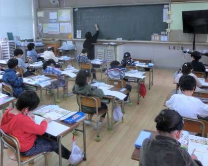 先生からの「先生が黒板に書くのと同じ速さで、ノートに書けるかな」の声かけに、子どもたちは集中して、黒板を写していました。