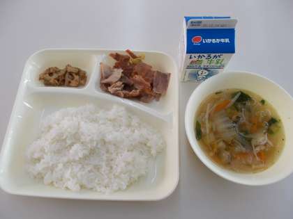 「すまし汁」は、昆布とけずりぶしでとっただしに、鶏肉、はくさい、にんじん、みつばなどを使っています。