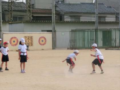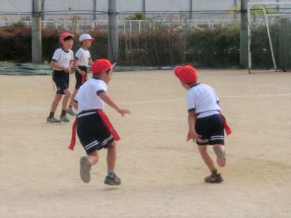 「タグラグビー」、タックルのかわりに腰につけたタグ(ひも)を取ります。