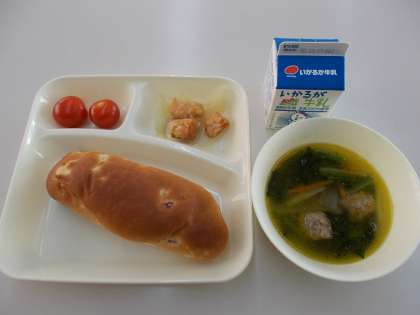 「肉だんごと麦のスープ」は、肉だんごと食物せんいたっぷりの押し麦を使ったスープです。具は、旬のだいこんや、ほうれんそう等です。