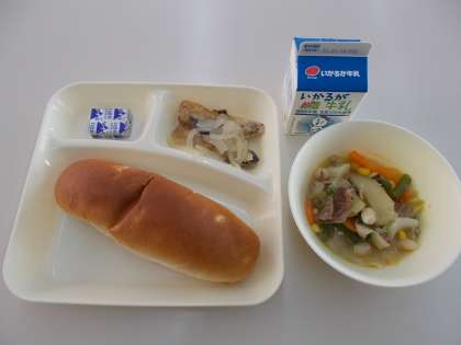 「あじのレモンマリネ」は、あじをなたね油で揚げて、炒めたたまねぎとレモン汁で作ったマリネ液をからませています。今日使っているレモンは広島県産のレモンで、レモン汁は給食室で絞ってとりました。
