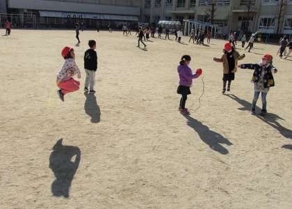 池に氷が張るほどの寒さでしたが、子どもたちは、ドッジ、バスケ、鬼ごっこ、なわとび、鉄棒…思い思いに友だちと、元気に体を動かし、楽しんでいました。