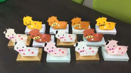 子どもたちの食べる姿を見られなくなった給食調理員さんが、「子どもたちに元気を!」と、給食ホールの掲示物と各学級に飾る牛の置物をつくりました。