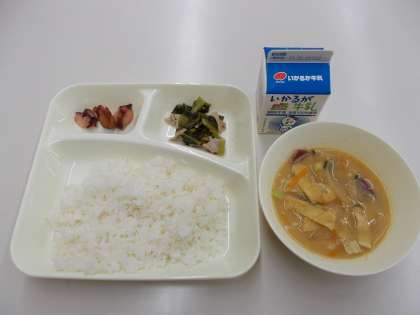 「みそ汁」は、具にさつまいも、うすあげ、たまねぎ、にんじん、えのきたけ、青ねぎを使っています。