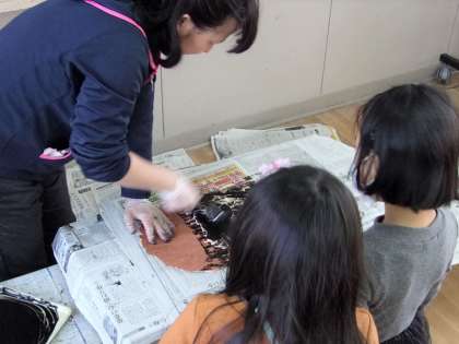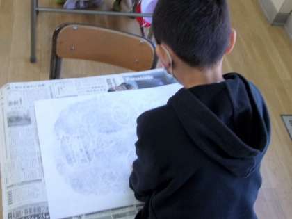 「紙版画」、インクをつけて、バレンでしっかりこすりました。