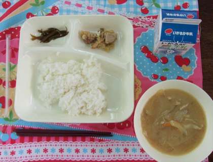 「豚汁」は、豚肉、じゃがいも、たまねぎ、だいこん、ごぼう、にんじんを使っています。
