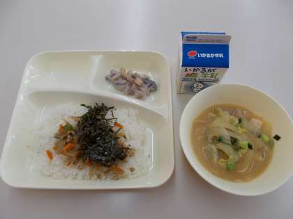 「鶏ごぼうごはん」は、鶏ひき肉、つきこんにゃく、ごぼう、にんじん、グリンピースで作った具を、食べる時に児童が自分で白ごはんと混ぜ込んで食べるまぜごはんです。