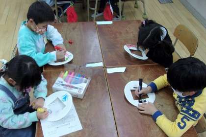 紙皿の真ん中を切り取って、写真立てをつくります。