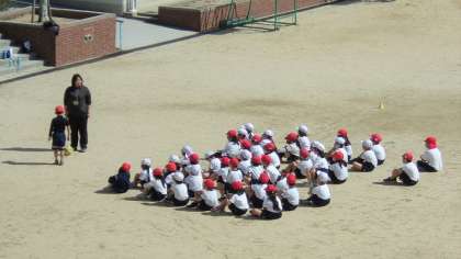 もうすぐ2年生、縦横の列を意識して並べます。先生のお話もしっかり聞けます。