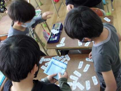 楽しみながら九九の復習、問いの答えになる式のカードをかるた形式で取り合います。