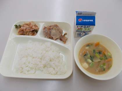 「とうふのみそ汁」は、給食室の釜でとっただしこんぶとけずりぶしのだし、とうふ、だいこん、にんじん、青ねぎを使っています。みそは、赤みそと白みそを使っています。