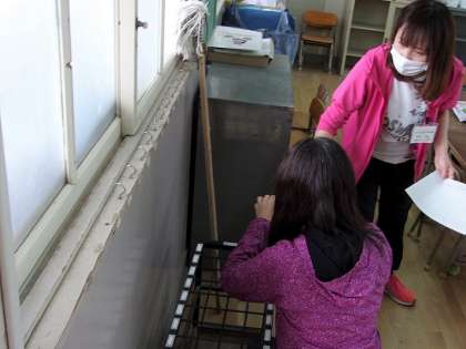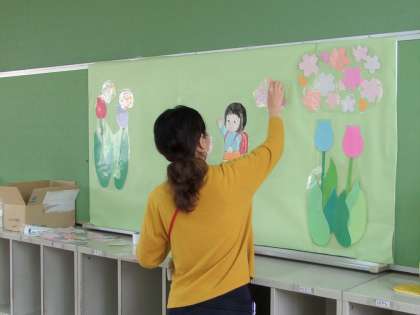 新1年生の教室の飾りつけ、子どもたちが毎日使うロッカーやくつ箱、傘立てに、名前を貼りました。