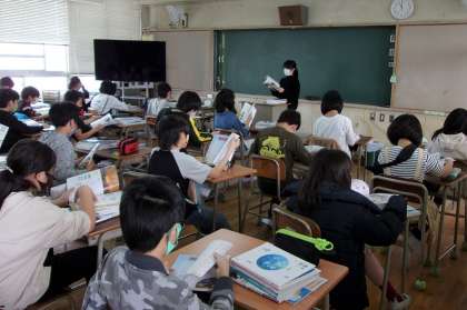 教科書を受けとりました。「どんなことを学ぶのか?」子どもたちは興味をもって教科書を開いていました。