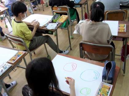 「絵の具+水+ふで=いい感じ!」で、しゃぼん玉を描きました。