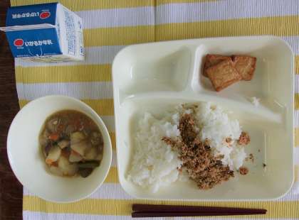 鶏肉とじゃがいもの煮もの、あつあげのしょうゆだれかけ、紅ざけそぼろ