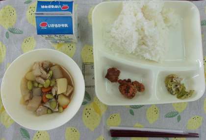 まぐろのオーロラ煮、含め煮、キャベツの赤じそあえ