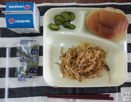 焼きそば、きゅうりのしょうがづけ