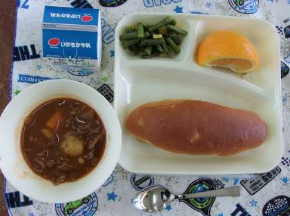 ビーフシチュー、さんどまめとコーンのサラダ、あまなつかん