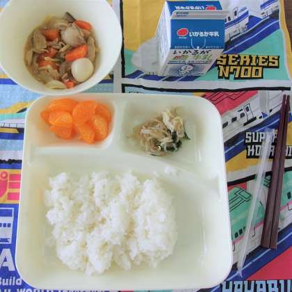 八宝菜、チンゲンサイともやしのしょうがあえ、みかん(缶)