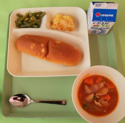 ケチャップ煮、さんどまめとコーンのソテー、りんごのクラフティ