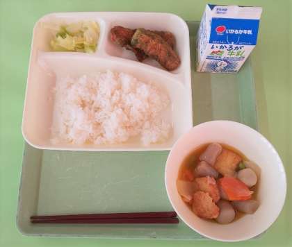 ちくわのいそべあげ、あつあげとさといもの煮もの、あっさりキャベツ