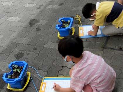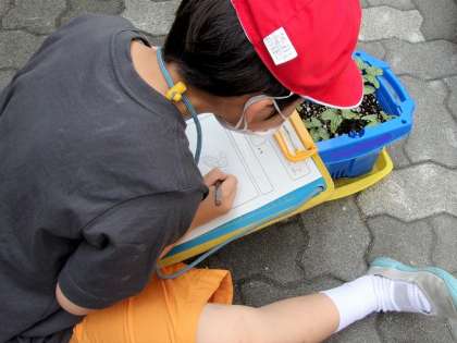 「ふたばが でたよ」、葉っぱのすじもしっかり観察し、ふたばの絵を描きました。