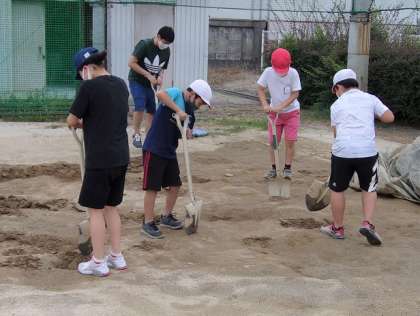 ガチガチに固まった砂場を掘りおこし、柔らかくしました。
