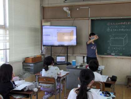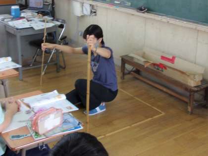 一つの辺の長さが1mの立方体(サイコロの形)を、1mのものさしを12本使って、児童の手も借りながら、作りました。