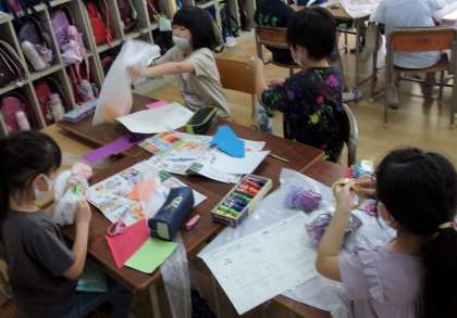 「カラフル フレンド」、ビニール袋に色画用紙を丸めたり、くしゃくしゃにして入れます。また、カラーペンで色を塗ったりして、作品を完成させます。