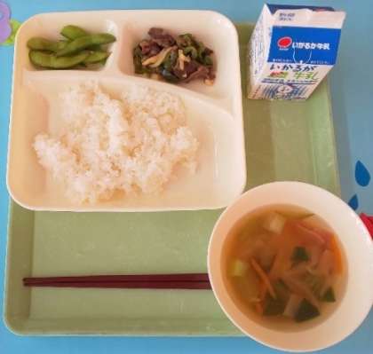 チンジャオニューロウスー、ハムと野菜の中華スープ、えだまめ