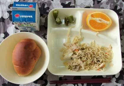 和風焼きそば、オクラの甘酢あえ、オレンジ