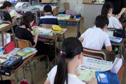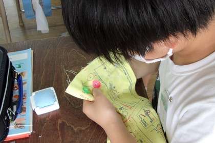 「手縫い」、ボタンをつける練習をしました。おうちでお手伝いをしている人は上手です。