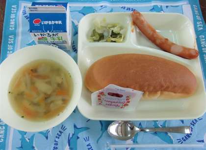 ウインナーのケチャップソース、スープ、キャベツとさんどまめのサラダ