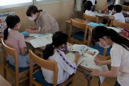 友だちに誕生日をたずねます。何月何日生まれかが分かれば、ワークシートの生まれ月の欄に、その友だちの名前を書きます。