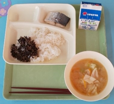 さごしの塩焼き、みそ汁、牛ひじきそぼろ