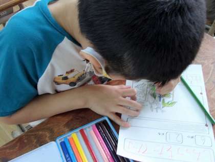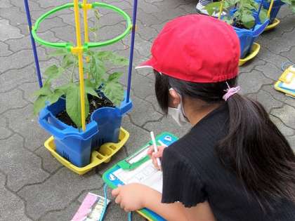 アサガオの葉がどんどん大きくなっています。よく見てスケッチし、色を塗りました。