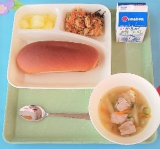 カレードリア、豚肉とキャベツのスープ、りんご(カット缶)