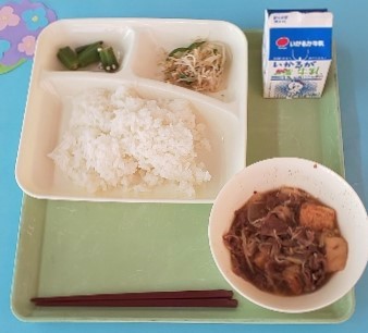 すき焼き煮、オクラのかつお梅風味、もやしとピーマンのごまいため