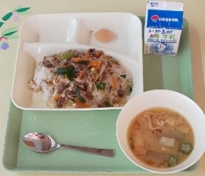 牛丼、とうがんのみそ汁、白花豆の煮もの