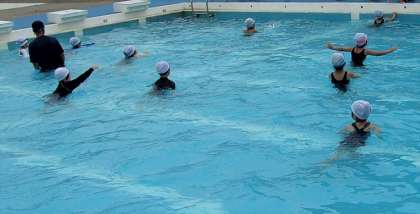 水の中を歩いて、向かい側の壁にタッチして戻ってきます。2回目は、手足を速く動かして、スピードをあげます。