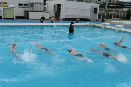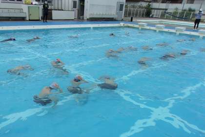 クロールで25m泳ぎました。次回の授業では、平泳ぎの練習をします。