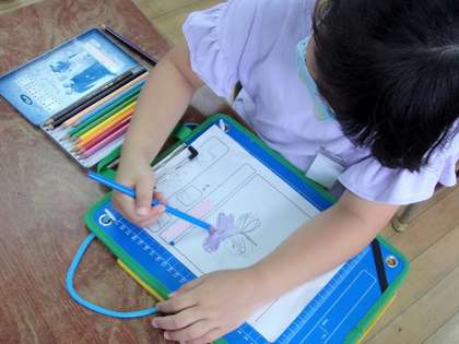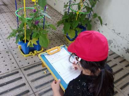 「はなが さいたよ」、アサガオが花をたくさん咲かせました。子どもたちは花を観察し、スケッチしました。