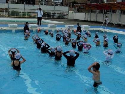 先生の動作に合わせて、子どもたちは水中で体を動かします。