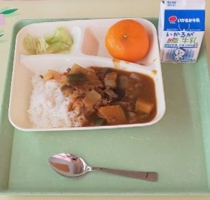 夏野菜のカレーライス、キャベツのサラダ、みかん(冷)