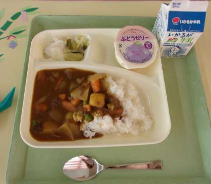 ビーフカレーライス(米粉)、野菜ピクルス、ぶどうゼリー、牛乳