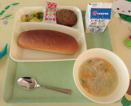 焼きハンバーグ、豆乳スープ、キャベツとピーマンのカレーソテー、パン・牛乳