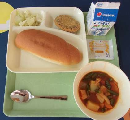 チキンレバーカツ、ケチャップ煮、キャベツのバジル風味サラダ、パン・牛乳、マーマレード